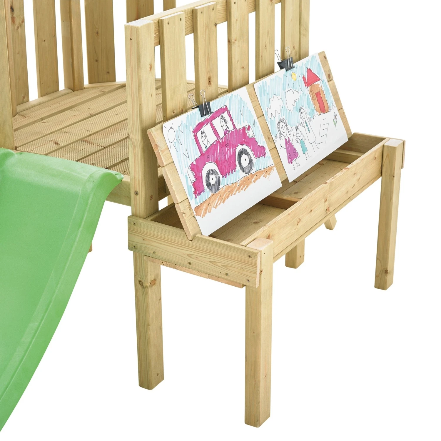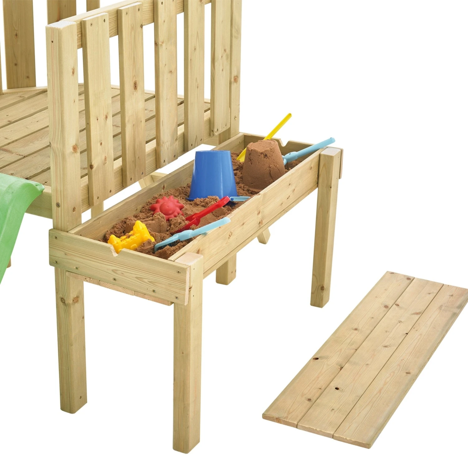 - The playcentre comes complete with the comfy all fabric foldaway swing seat, fun lime slide and table sandpit with all wood cover to keep the sand clean.