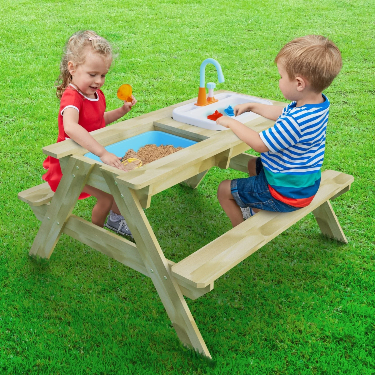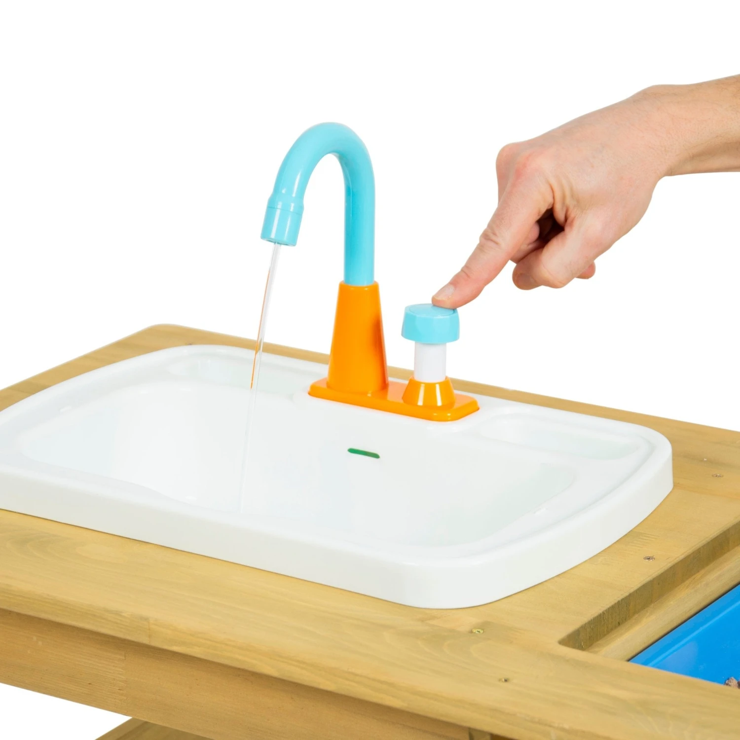 This picnic table is packed full of activities, including a splash tub to fill with sand or their favourite finds in the garden and even a working sink! Pump the button to get running water, rotate your spout and drain once you are done. The working sink recycles the water, providing continuous play without the need to refill.
