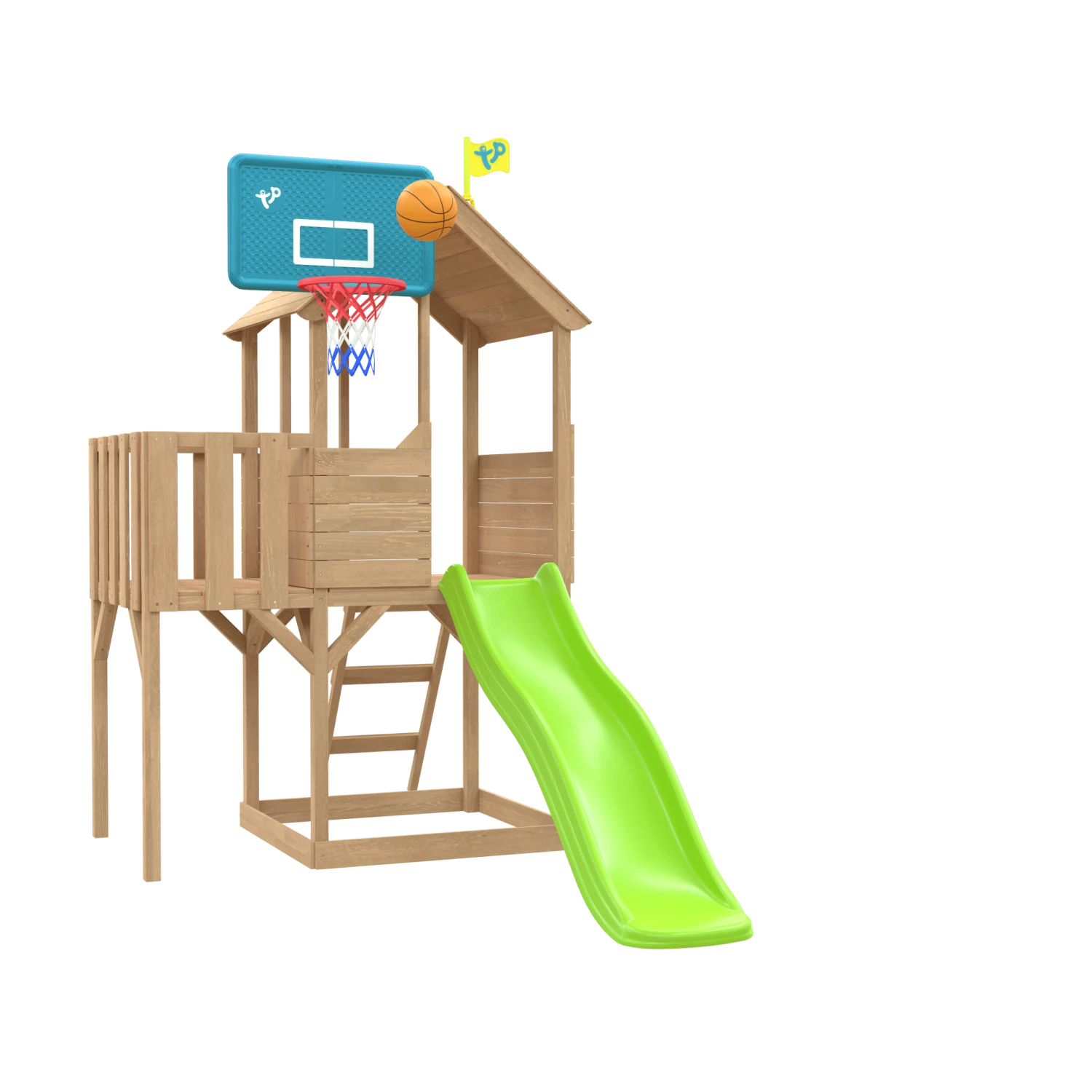 - Play Tower comes with a wooden lookout balcony, basketball hoop & our best selling wavy slide.